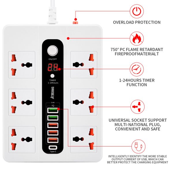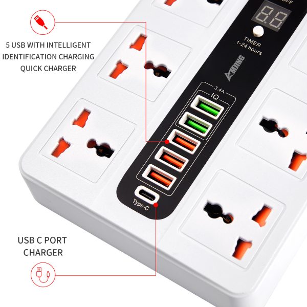 This power socket boasts 5 USB ports, making it perfect for charging smartphones, tablets, and other electronic devices. Coupled with a robust design that supports 3000 watts, it delivers reliable performance and safety.